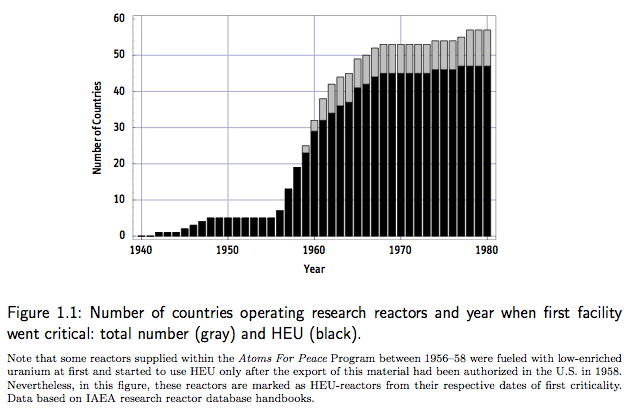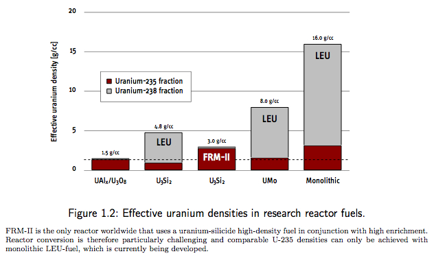 In particular, but not only, the nuclear-weapon states currently consider progress in nuclear disarmament of secondary relevance, arguing that the possibility of nuclear terrorism and the (further) proliferation of nuclear weapons pose the most serious threat to global security. Nevertheless, it is widely recognized that a revitalization of the nuclear disarmament process is essential to reduce the `demand' for these weapons and a precondition to prevent the proliferation of nuclear weapons in the long term. Most recently, this requirement has been re-emphasized in the final report of the U.N. High-level Panel on Threats, Challenges and Change --- and it's also, of course, the fundamental bargain underlying the Nonproliferation Treaty. In spite of the current standstill in nuclear disarmament, there are fortunately important related areas where the objectives and interests of the international community clearly coincide. In particular, there is now a broad international consensus about the importance and urgency of consolidating and reducing the stockpiles of nuclear-weapon materials located around the world. These measures are important because they lower proliferation risks due to the potential diversion or theft of nuclear material. At the same time, reducing and eliminating excess stocks of these materials strengthens the nonproliferation regime in general and, ultimately, also supports irreversible nuclear disarmament. In this context, highly enriched uranium (HEU) has attracted particular public and political attention. Several characteristics of HEU make it the material of choice for low-tech proliferators. In contrast to plutonium, it is relatively easy to handle and conceal due to its low level of radioactivity and, more importantly, only HEU can be used in the most basic weapon-design based on the so-called gun-type method. There is now a broad international consensus that this material has to be removed from the nuclear fuel cycle as soon as possible. The current civilian HEU stockpile has been estimated to about 50 metric tonnes, which is much less than the inventory reserved for military purposes, but still enough for several thousand nuclear weapons or explosive devices. Virtually all of the civilian weapon-grade uranium is associated with the present or former use in HEU-fueled research reactors. During the 1960s, a large number of research reactors started to use HEU and, as a result, almost 50 countries received highly enriched uranium to fuel these facilities (Figure 1). Many HEU-fueled reactors have been shut down or converted to low-enriched fuel since then, but more than 100 reactors worldwide still use HEU in their cores. Eliminating HEU from the civilian nuclear fuel cycle therefore requires a two-pronged approach. First, legacy materials stemming from the former use in research reactors, which are usually still being stored at the respective reactor sites worldwide, have to be consolidated and, ultimately, down-blended to low enrichment. Second, the remaining operational HEU-fueled research reactors in the world have to be converted to low-enriched uranium to eliminate the demand for fresh HEU. The latter has significantly dropped since the creation of the Reduced Enrichment for Research and Test Reactors (RERTR) Program in 1978, but still amounts to about one metric tonne per year. Both areas have gathered considerable new momentum since 2002. Major national and international programs have been launched recently to carry out a complete global cleanout of highly enriched uranium and other high-risk materials. Similarly, for the first time, the conversion of all research reactors worldwide has been defined as an explicit objective with a target date for completion within a decade. However, while the global `cleanout' of HEU is an uncontroversial undertaking, the conversion of research reactors is a more complex technical and administrative process, because the interests of reactor operators and users are involved. Potential criteria to guide a conversion process include minimum reactor core modification, minimum changes in operational characteristics and neutron flux values, minimum licensing problems, minimum fuel cycle costs, etc. From a purely technical perspective, highly enriched fuel is always superior to low-enriched fuel due to the higher concentration of fissile U-235 and the lower parasitic absorption in U-238 --- both characteristics that however also explain the weapon-usability of HEU. To overcome this disadvantage of low-enriched fuels, the development of advanced high-density fuels for research reactors began within the framework of the RERTR program, raising effective uranium densities in the fuel several-fold compared to the initial 1.0--1.5 g/cm3 that were achievable until the 1980s (Figure 2. The availability of these fuels is a prerequisite for meeting most of the technical and economic criteria relevant in a conversion process. In 2002, a new potential fuel-type with an extraordinary uranium density of 16 g/cm3 (monolithic fuel) was discovered, which is now becoming the subject of an important international R&D-effort. The new spirit and urgency of converting the remaining HEU-fueled reactors to low-enriched fuel, combined with the prospects of new ultra-high-density fuels, provides the main impetus and defines the basic scientific objectives for this thesis.